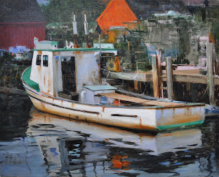 This is a 16x20 oil on linen, "In For The Night". This painting for me, is about the late afternoon light on the boat, and the reflections in the water. That along with what I think is a beautiful shape of this particular work boat. This is another Maine painting. Boats, water and light are some of my favorite things to try and capture in paint. This piece will hopefully look better when it is varnished and the uneven shine of the oxidation process is eliminated. I always prefer to shoot the work after it is totally tried. This painting is still very wet.